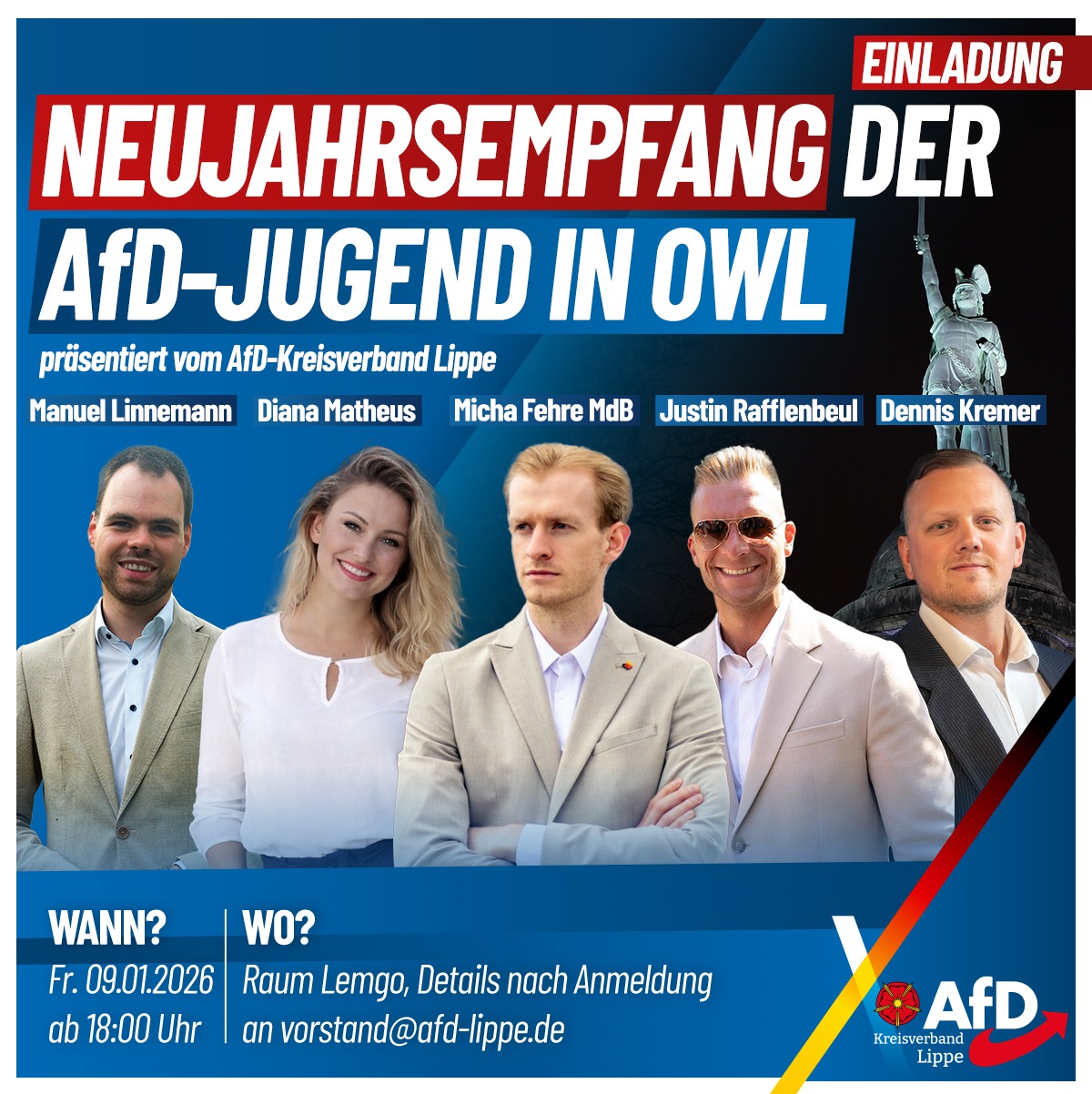 Herzliche Einladung zum Neujahrsempfang der AfD-Jugend in OWL am Freitag, den 09.01.2026, ab 18:00 Uhr in Lemgo. Anmeldung unter vorstand@afd-lippe.de